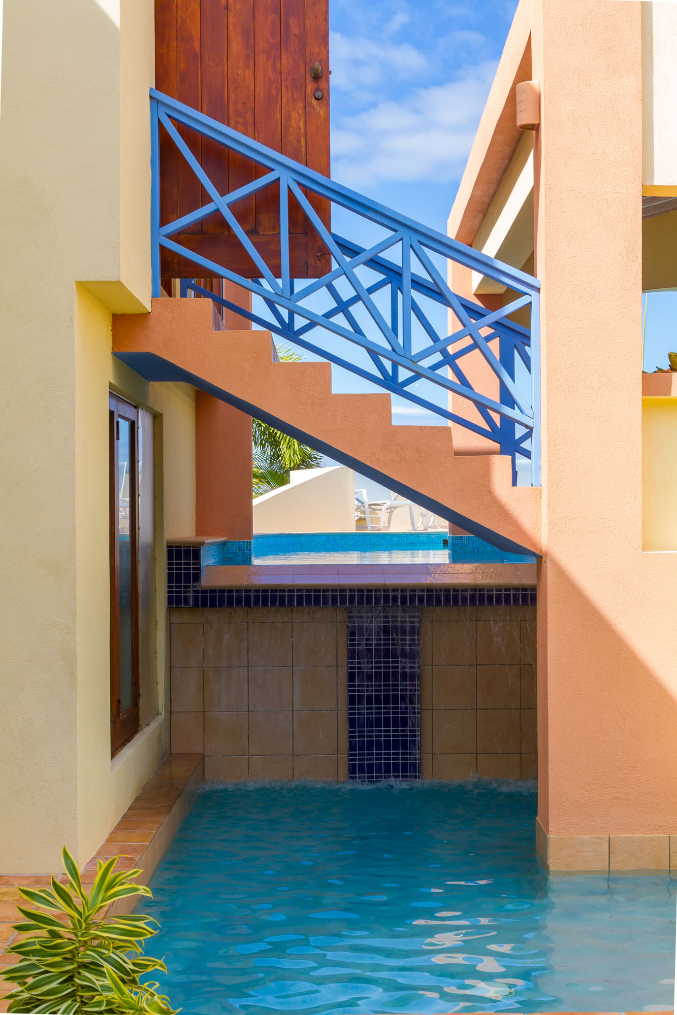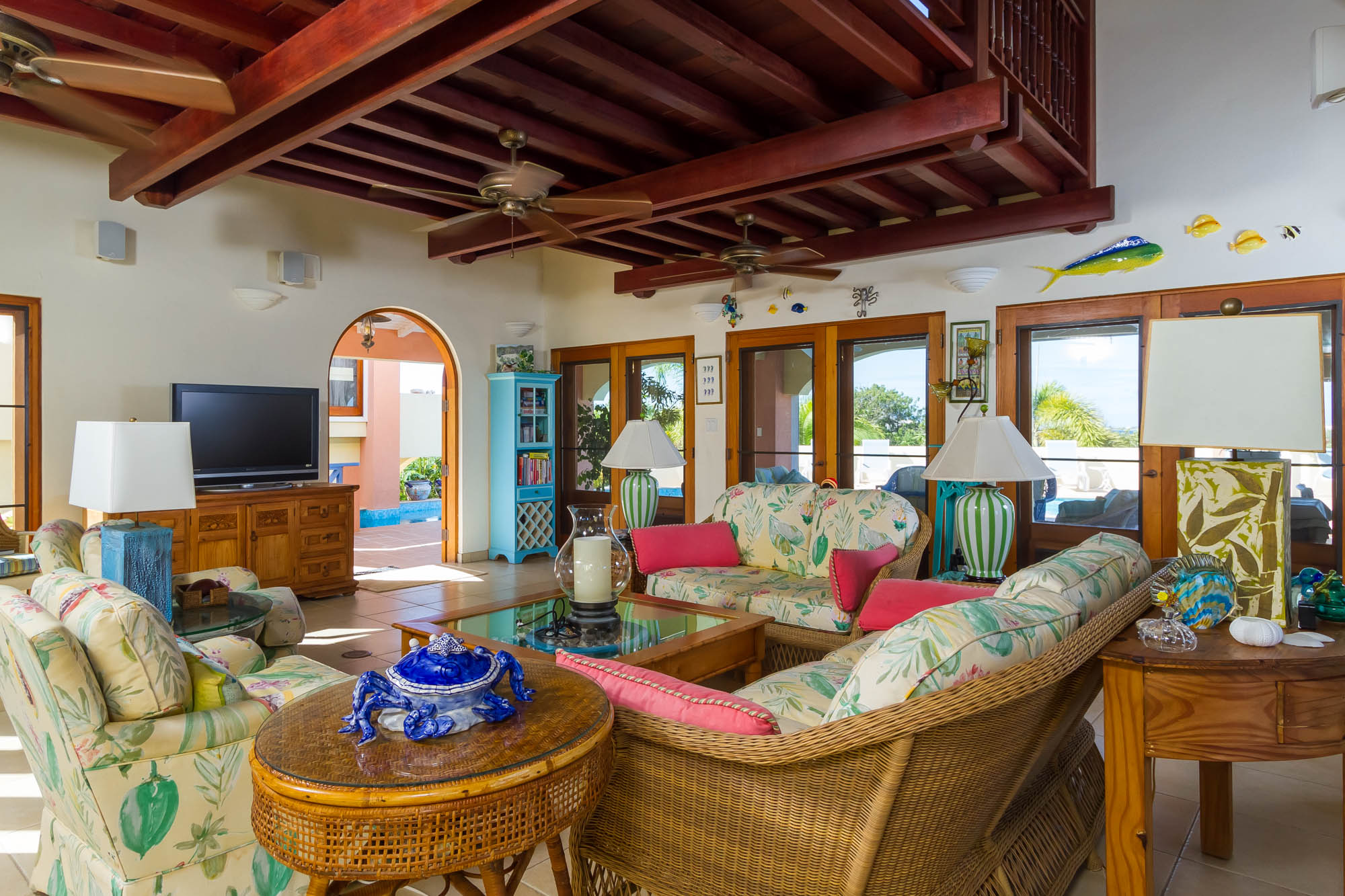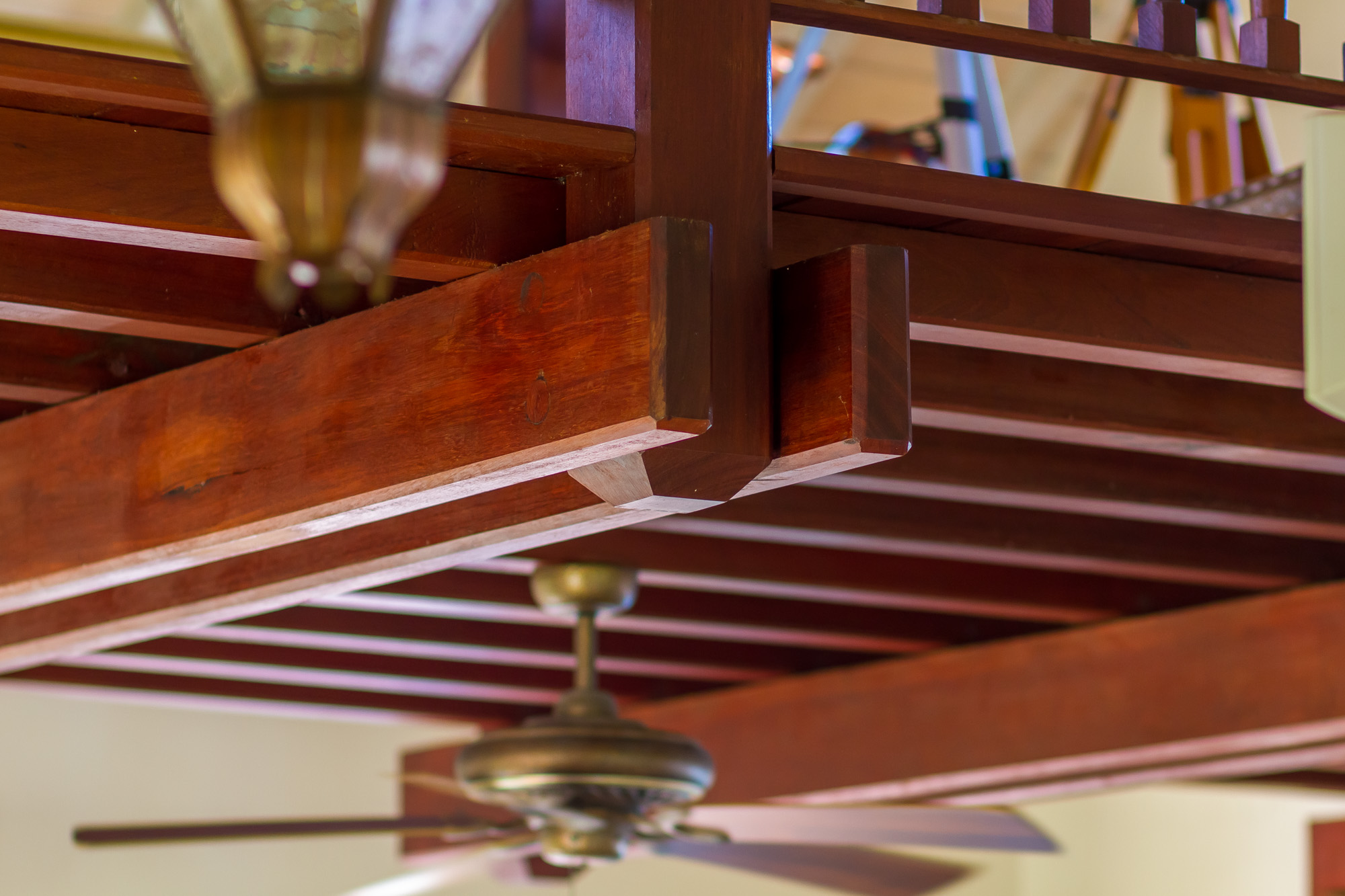 - Wood railed gallery over living room, leading to veranda over pool deck